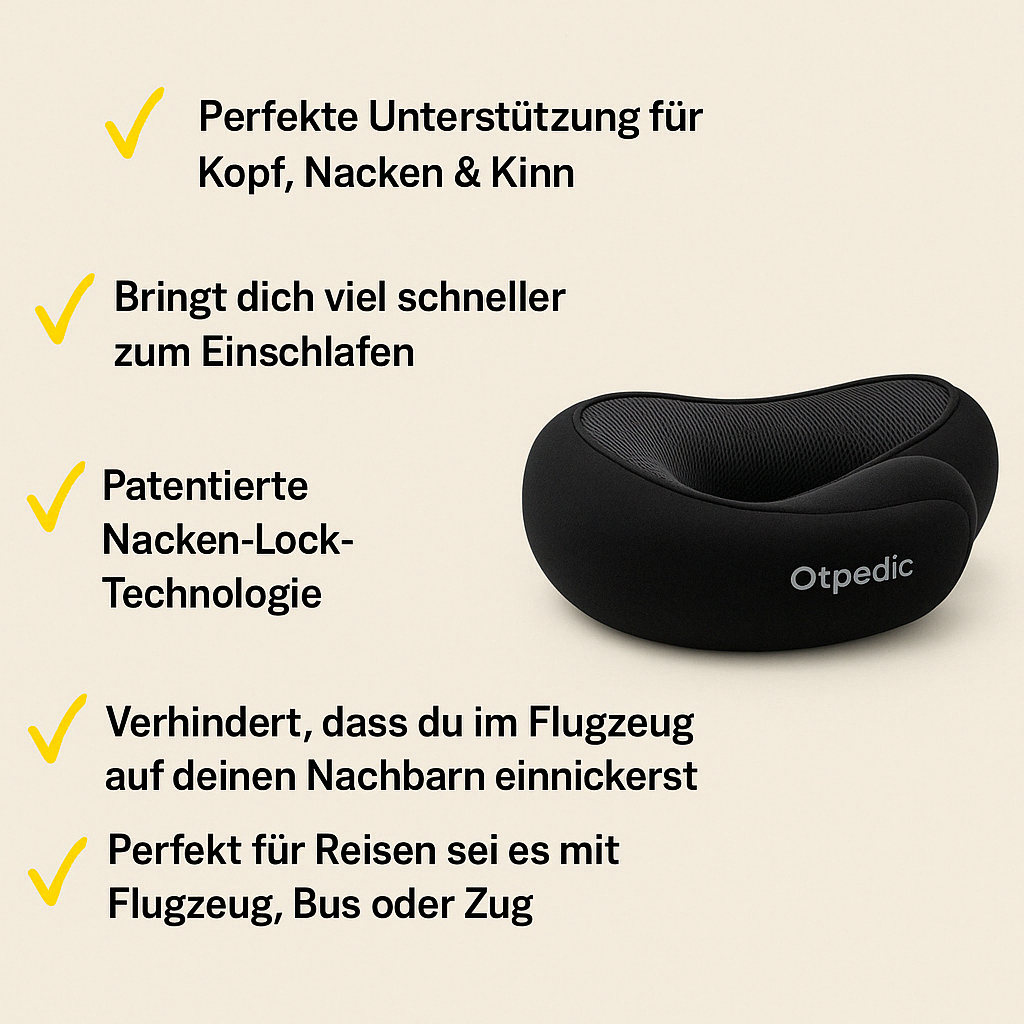 Unser orthopädisches Nackenkissen bietet perfekte Unterstützung für Kopf, Nacken und Kinn und sorgt dafür, dass Sie in jeder Situation besser entspannen können. Ob im Flugzeug, Zug oder unterwegs – das Kissen hilft Ihnen, bequem einzuschlafen, ohne dass Sie Gefahr laufen, mit dem Kopf beim Nachbarn einzunicken. Es sorgt für eine stabile Haltung und verhindert unangenehme Verspannungen oder Schmerzen, die durch eine falsche Kopfposition entstehen können. Dank des ergonomischen Designs passt sich das Kissen optimal an Ihre individuellen Bedürfnisse an und bietet langanhaltenden Komfort. Es ist leicht, kompakt und lässt sich einfach transportieren, sodass Sie es überall mitnehmen können. Ob im Büro, auf Reisen oder bei einem kurzen Ausruhen zu Hause – unser Nackenkissen bietet Ihnen Unterstützung und fördert Ihre Entspannung. Ein weiterer Vorteil: Der abnehmbare, waschbare Bezug sorgt für einfache Pflege und Hygiene, während der langlebige Schaumstoff seine Form und Stützkraft über lange Zeit behält. Dieses Nackenkissen ist die ideale Wahl für alle, die Wert auf Komfort und Wohlbefinden legen – jederzeit und überall.