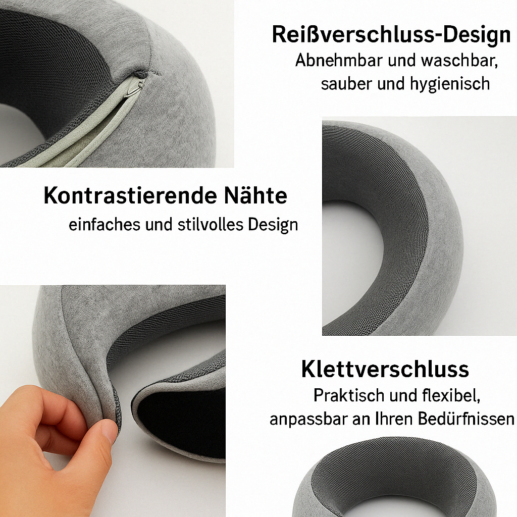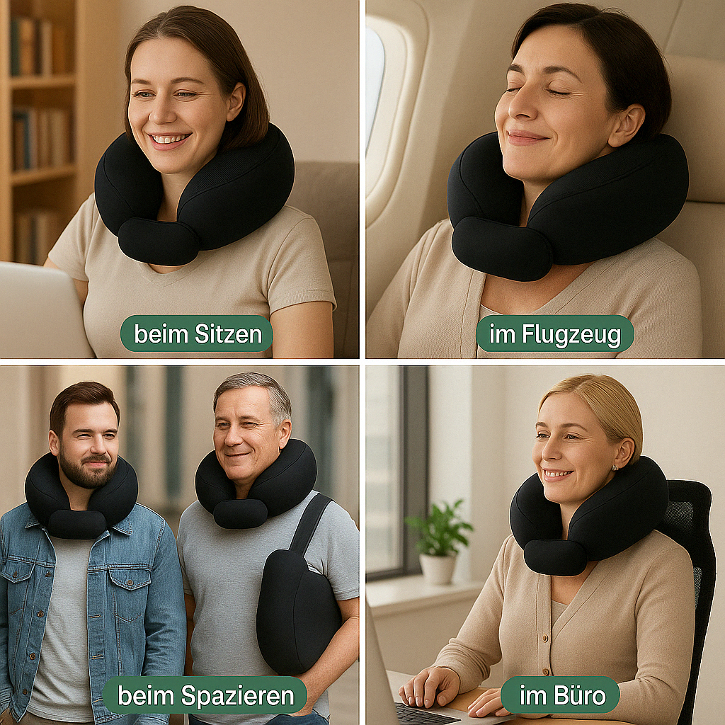 - Verbesserte Haltung: Fördert die korrekte Ausrichtung von Halswirbelsäule und Nacken – ideal für langes Sitzen im Flugzeug, im Auto oder im Büro. So werden Fehlhaltungen vermieden und die Gesundheit des Bewegungsapparates unterstützt.